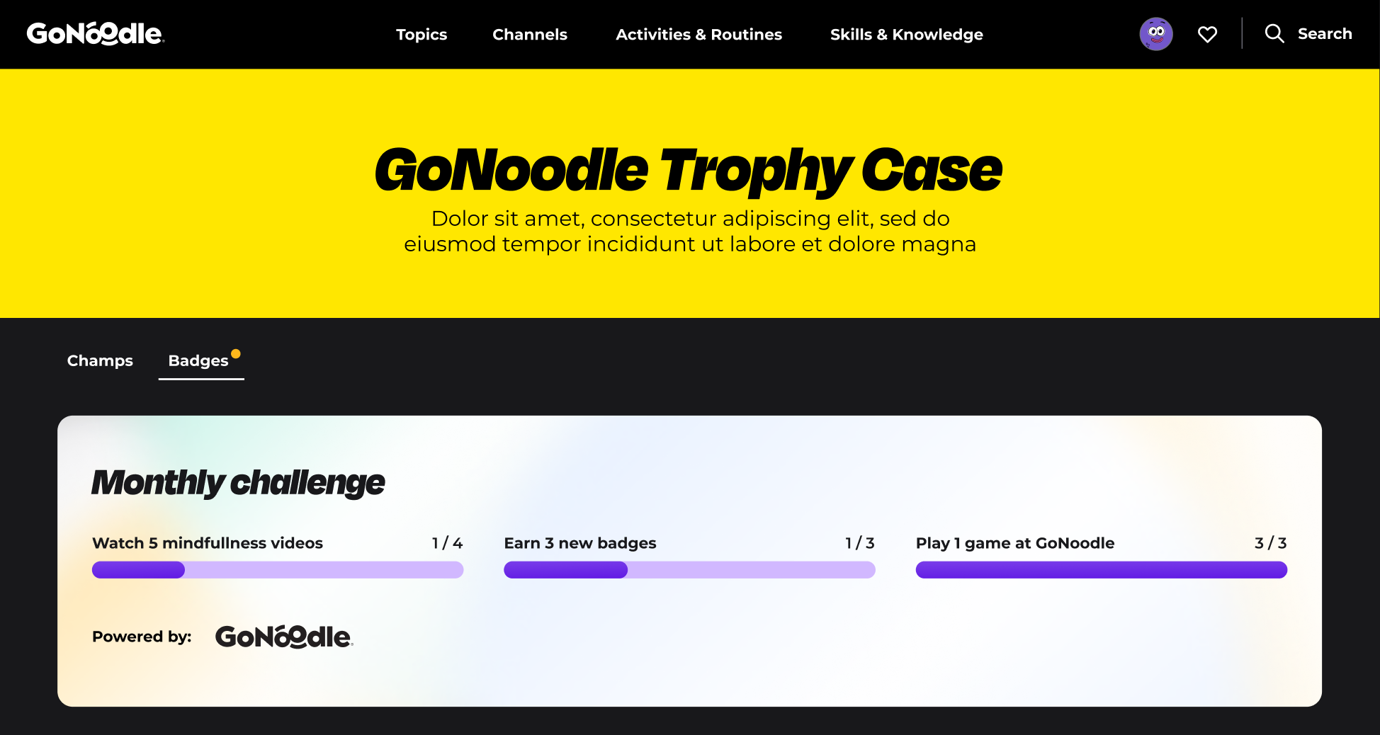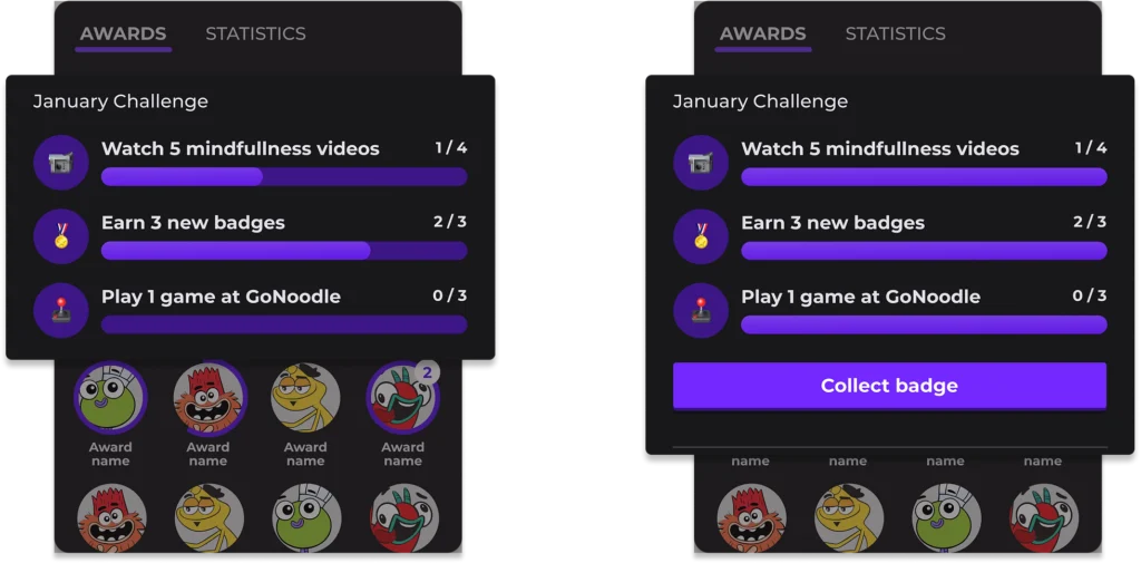 With this message in mind, I’ve crafted the evolved gamification system – Trophy Case 🏆! For the best user experience Trophy Case has 2 entry points and has General and Mini representation inside GoNoodle platform.