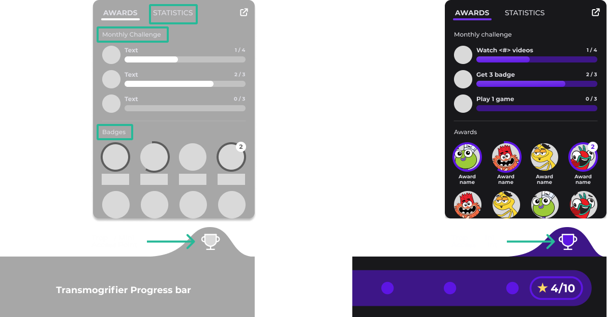 My primary goal was to evolve Transmogrifier from a simple progress mechanic into a complete engagement ecosystem—one that would lead students to deeper exploration, achievement recognition, and long-term motivation through structured, yet joyful challenges.