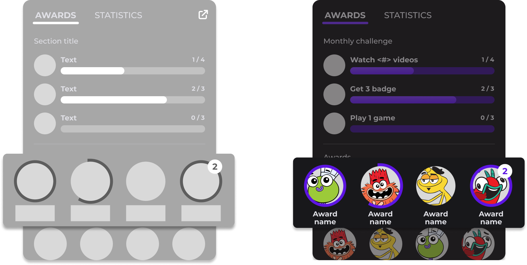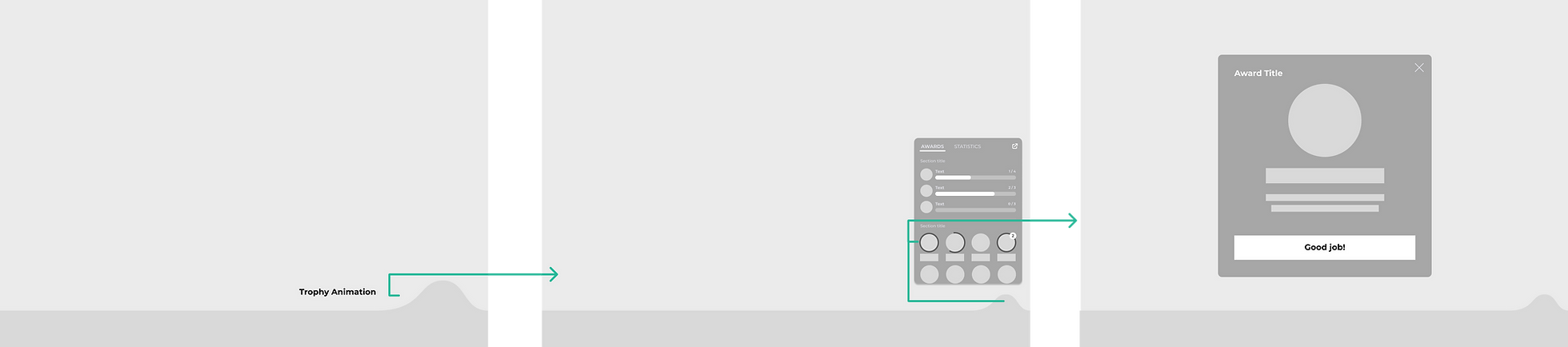 As I’ve mentioned previosly, the badges are living in the mini/big trophy case, but how the students know when they’ve unlocked a new badge? Let me show the simple wireframe flow. (Leave some patience for the final result!)