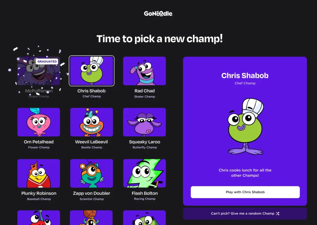 GoNoodle already had gamification element, the most notable being the Transmogrifier system – one of the most beloved features among students and teachers. It wasn’t just a feature; it was an experience, creating emotional connections between students and their Champs while making learning feel like a game. Let me tell you more about it, so we’re on the same page 🙂